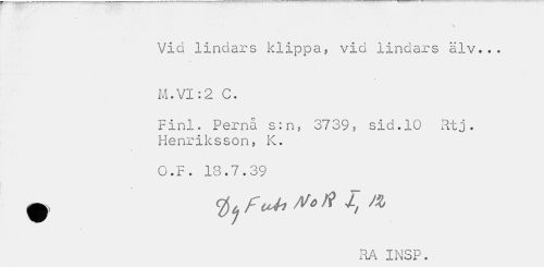 //// \ //// Vid lindars klippa, vid lindars älv... M. VI: 2 C. //// Finl. Pernå s:n, 3739, sid.10 Rt j. Henriksson, K. //// O.F. 18.7.39 //// RA INSP. ////