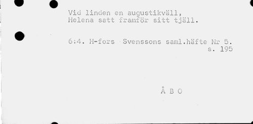 //// Vid linden en augustikväll, //// w * //// Helena satt framför sitt tjäll. //// 6:4. H-fors -Svenssons saml.häfte Nr 5. //// s. 195 //// ÅBO //// v //// _ ___A ////