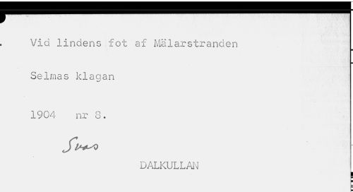 //// Vid lindens "fot af Mälarstranden Selmas klagan //// 1904 nr 8. //// J/^o //// DALKULLAN //// I ////