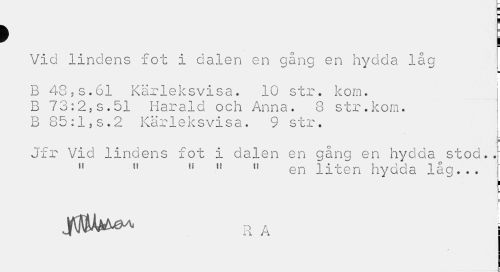 //// ! //// > i //// Vid lindens fot i dalen en gång en hydda låg //// B 4S,s.61 Kärleksvisa. 10 str. kom. B 73:2?s.51 Harald och Anna. 8 str.kom. B 85:l,s.2 Kärleksvisa. 9 str. //// Jfr Vid lindens fot i dalen en gång en hydda stod.." //// " n " !f M en liten hydda låg... //// f //// i //// } //// . t //// ra i //// l ////
