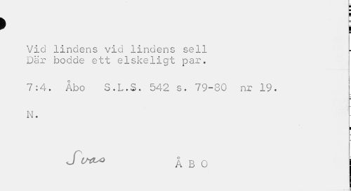 //// > j //// Vid lindens vid lindens sell Där bodde ett elskeligt par. //// 7:4. Åbo S.L.S. 542 s. 79-80 nr 19. //// N. //// I //// SV*" ÅBO //// = ////