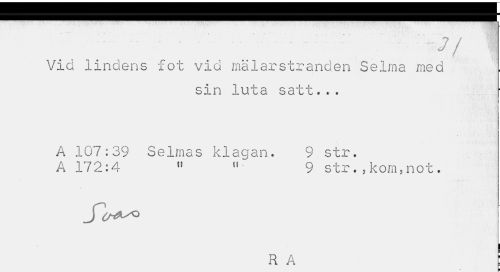 //// Vid lindens fot vid mälarstranden Selma med //// sin luta satt... //// A 107:39 Selmas klagan. 9 str. A 172:4 n " 9 str.,kom,not. //// i //// r a : //// ¦ ////