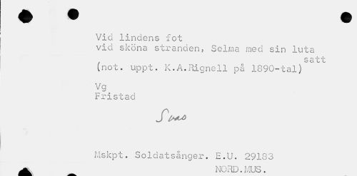 //// Vid lindens fot //// vid sköna stranden? Selma med sin luta //// satt //// (not. uppt. K.Å.Ricnell på 1890-tal) //// Vg //// Fristad //// Mskpt. Soldatsånger. E.U. 29183 //// T» r/-\ —T iMr rr^ ////