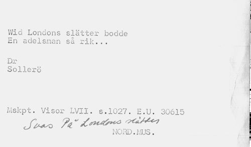 //// Wid Londons slätter bodde En adelsman så rik... //// « //// Dr : //// Sollerö //// :m //// ¦ t C ; //// Mskpt. Visor LVII. s.1027. E.U. 30615 i //// NORD.MUS. ! //// i ////