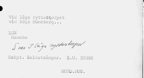 //// > //// Vid låga rytta±t;orpet vid höga Huneberq*.. //// LGä Hanebo //// Mskpt. Soldatsånger. E.U. 29398 //// NORD.MUS. ////