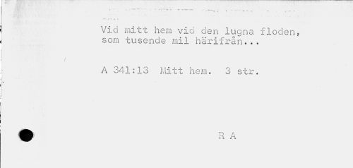 //// » * i- •<-—"*¦'. ~ " * - ---. *—• - J -».T r. y -r- - //// ' r ~ -a * //// Vid mitt hem vid den lugna floden? som tusende mil härifrån... //// i //// A 341:13 Mitt hem. 3 str. //// « ////