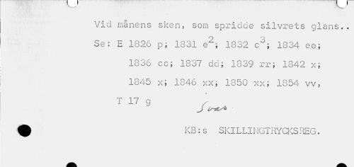 //// Vid månens sken, som spridde silvrets glans.. Se: E 1826 p; 1831 e2; 1832 c°; 1834 ee; //// 1836 cc; 1837 dd; 1839 rr; 1342 x; //// 1845 x; 1846 xx, 1850 xx; 1854 vv, T17 9 //// ^ KB:s SKILLINGTRYCKSREG. ////