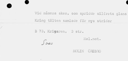 //// Vid månens sken* som spridde silfrets glans Kring tälten samlade för nya strider //// / / //// B 735 Krigaren, 3 str. //// ~ Mel.not. //// J IMA) //// MOLIN ÖREBRO ////