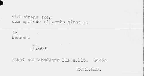 //// f //// Vid månens sken //// som spridde silvrets glans... //// •PN //// Dr //// Leksand //// J u^^ //// Mskpt soldatsånger III.s.115. 24424 //// NORD.MUS. ////