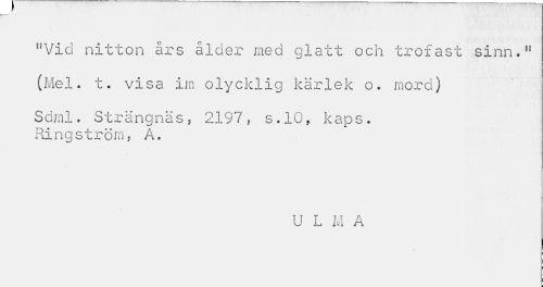 //// uVid nitton års ålder med glatt och trofast sinn." //// (Mel. t. visa im olycklig kärlek o. mord) //// Sdml. Strängnäs, 2197, s.10, kaps. Ringström, A. //// U L M A ////
