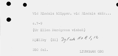 //// Vid Rindals klippor, vid Rindals skär... s . 7 - 9 //// (Ur Ellen Nordgrens visbok) Mjällby (Bl) tyfuJi //// o5u x01, LIUNGMAN GBG ////