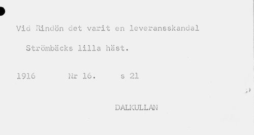 //// > //// Vid Rindön det varit en leveransskandal //// I //// Strömbäcks lilla häst. 1916 Nr 16. s 21 //// i» //// DALKULLAN ////