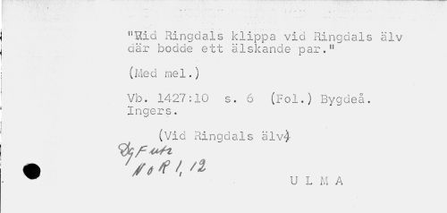 //// n » r 1 - • . i //// v t T ^ , . //// "Rid Ringdals klippa vid Ringdals älv där bodde ett älskande par." //// (Me d me 1.) //// Vb. 1427:10 s. 6 (Fol.) Bygdeå. Ingers. //// (Vid Ringdals älv^ w U L M A ////