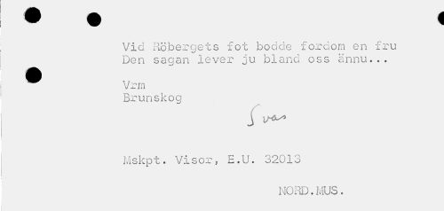//// Vid Röbergets fot bodde fordom en fru Den sagan lever ju bland oss ännu... //// Vrm //// Brunskog //// Hl t**-- //// i //// Mskpt. Visor, E.U. 32013 //// NORD.MUS. ////