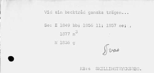//// Vid sin becktråd ganska träqen... //// W* //// Se: E 1849 bb^ 1856 11; 1857 ee; //// 1877 md //// N 1836 g //// KB : s S Kl L LI NGT RYCKS RE G. ////
