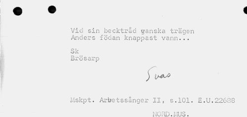 //// Vid sin becktråd ganska trägen Anders födan knappast vann... //// Sk //// Brösarp //// ) lheJ> //// i //// Mskpt. Artoetssånger II, s.101. E.U.22688 //// NORD.MUS. ////