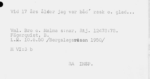 //// f //// Vid 17 års ålder jag var bad' rask o. glad.*. //// Vml. Bro o. Malma s:nar, Rtj. 12478:78. Fägerquist, B. //// L.M. 10.6.50 /Bergslagsrésan 1950/ M VI: 3 b //// RA INSP. ////