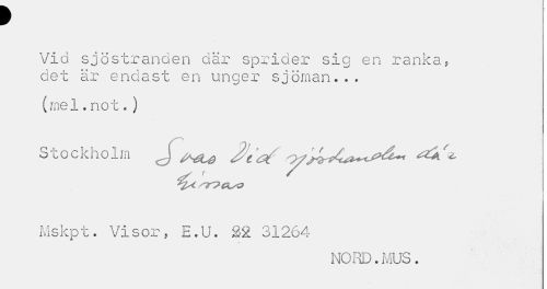 //// f //// Vid sjöstranden där sprider sig en ranka, det är endast en unger sjöman... //// (mel.not. ) //// Stockholm J ^^ Ji^ Mskpt. Visor, E.U. 22 31264 //// NORD.MUS. ////