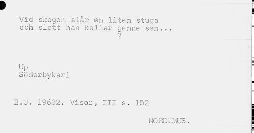 //// W k //// = //// Vid skogen står en liten stuga //// och slott han kallar genne sen... //// ? //// Up 1 //// Söderbykar1 //// ¦ //// E.U. 19632. Visor, III s. 152 , //// nord;.: mus . j ////