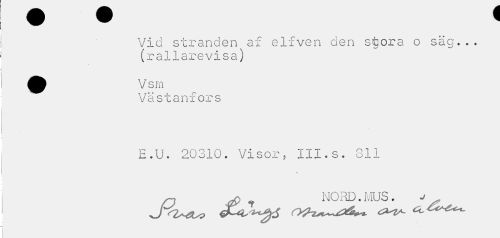 //// Vid stranden af elfven den stora o säg... (rallarevisa) //// Västanfors //// E.U. 20310. Visor, lll.s. 311 //// N //// O t NORD.MUS. V ////