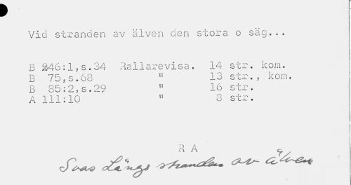 //// p //// Vid stranden av älven den stora o säg... //// i //// B 246:1,s.34 Hal1arevisa. 14 str. kora. B 75,s.68 " 13 str., kora. //// B 85:2,s.29 " 16 str. //// A 111:10 " 3 str. //// I //// D A //// a A ^ ////