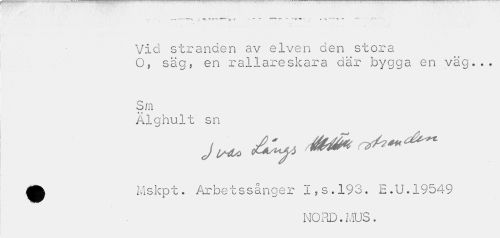 //// ~—** * > — - -r " ~ & ? - • * > -r #*> • V"-. //// Vid stranden av elven den stora //// O, säg, en rallareskara där bygga en väg... //// Sm //// Älghult sn //// Mskpt. Arbetssånger I,s.l93. E.U.19549 //// NORD.MUS. ////