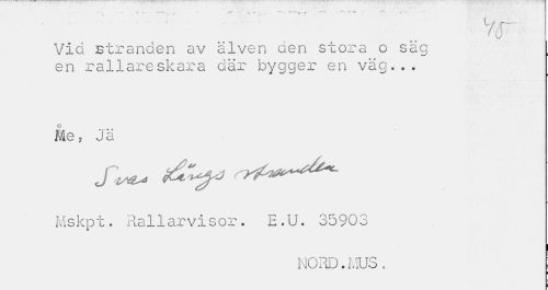 //// Via stranden av älven den stora o sag j //// en rallareskara där bygger en väg... //// o //// Me, Ja //// Mskpt. Rallarvisor. E.U. 35903 //// 1 //// NORD.MUS. //// i ////