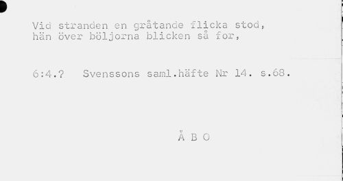 //// Vid stranden en gråtande flicka stod, ' //// hän över böljorna blicken så for, //// 6:4.? Svenssons saml.häfte Nr 14. s.68. //// i //// Å B O //// j ////