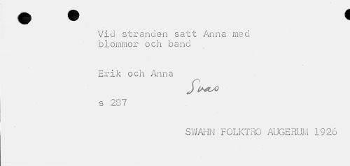//// Vid stranden satt Anna med blommor och band //// Erik och Anna //// $IklA //// s 287 //// SWAHN FOLKTRO AUGERUM 1926 ////
