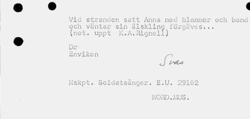 //// Vid stranden satt Anna med blommor och band och väntar sin älskling förgäves... (not. uppt K.A.Rignell) //// En vi ken //// J //// Mskpt. Soldatsånger. E.U. 29162 //// NORD.MUS. ////