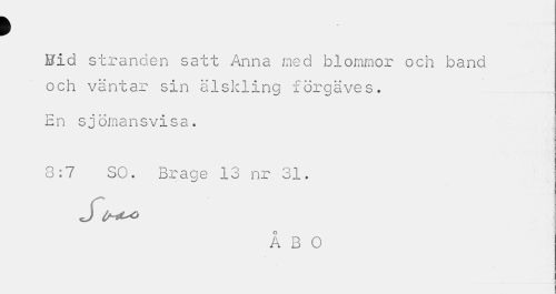 //// i //// Eid stranden satt Anna med blommor och band och väntar sin älskling förgäves. //// En sjömansvisa. //// 8:7 SO. Braoe 13 nr 31. Sit-nLsö //// ÅBO ////