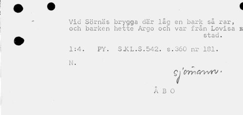 //// Vid Sörnäs brygga där låg en bark så rar, och barken hette Argo och var från Lovisa b ^^ stad. //// 1:4. PY. S.KL.S.542. s. 360 nr 181. //// N. //// Q) f07Y)CfVVtV < //// ÅBO ////