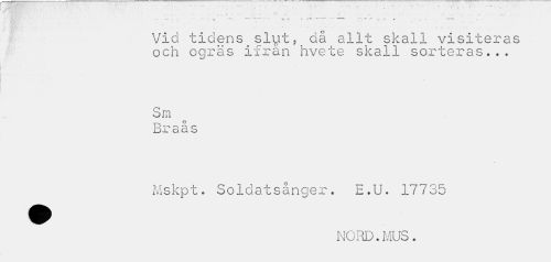 //// .— • y- • : —• — "se ji _ . * ~... -*1t r- „ • v f - r //// Vid tidens slut, då allt skall visiteras och ogräs ifrån hvete skall sorteras... //// Sm //// Braås //// Mskpt. Soldatsånger. E.U. 17735 //// NOiO.MUS. ////