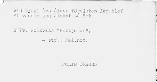 //// Vid tjugi års ålder försjuten jag blef //// Af vännen jag älskat så ömt s //// i //// B 79, Folkvisa "Försjuten11, //// 4 str.; Mel.not. //// MOLIN ÖREBRO //// i ¦ //// 1 ////