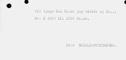 //// Vid tjugo års ålder jag visste ej än... //// \ //// Se: E 1860 ii; 1864 kk,mrns //// KB:s SKILLINGTRYCKSREG. ////
