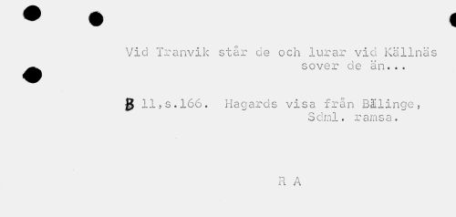//// Vid Tranvik står de och lurar vid Källnäs ^^^ sover de än... //// JJ 11?s.166. Hagards visa från Bälinge, //// Sc! ml. ramsa. //// D A //// K /i ////