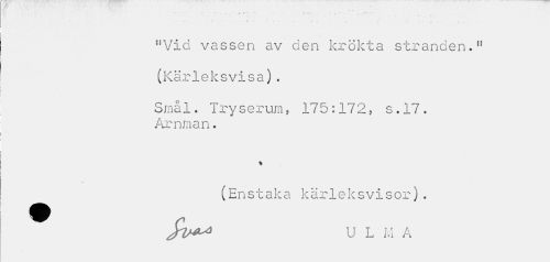 //// / m //// *... ' " f - * + ^ - " * ^ " / v ... ' * \ . - //// • » 4 ' ' //// • • •• fi .». { r - 4 , flVia vassen av den krökta stranden." //// (Kärleksvisa) . //// Srnål. Tryserum, 175:172, s.17. //// Amman. //// / //// (Enstaka kärleksvisor). Sv^ U L M A ////