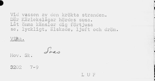 //// I //// Vid vassen av den krökta stranden. ; //// Där Kärlekslågar hördes susa. //// o //// Lat ömma känslor dig förtjusa //// se, lyckligt, älskade, ljuft och dröm. //// ViBa. i //// tS^L^O //// Hov. Sk. //// i //// 3202 7-9 //// L U F ////