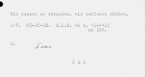 //// ¥ //// Vid vassen av stranden, vid sorlande bäcken, //// 3:7. Fö-JO-LE. S.L.S. 46 s. 410-411 //// nr 158. //// N. //// ÅBO //// k ////