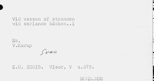 //// > i //// Vid vassen af stranden vid sorlande bäcken..! //// Sk. : //// V.Karup //// ^tAAsO . //// E.U. 22015. Visor, V s.379. I //// NORD.MUS | ////