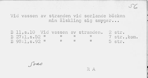 //// Vid vassen av stranden vid sorlande bäcken //// min älskling sig smyger... //// B lljS.10 Vid vassen av stranden. 2 str. B 27 :1 ? s.52 " 11 » 11 7 str. , kom. //// B 98:15 s. 92 13 » » 51 5 str. //// J^inU) //// R A ' //// ¦ ////