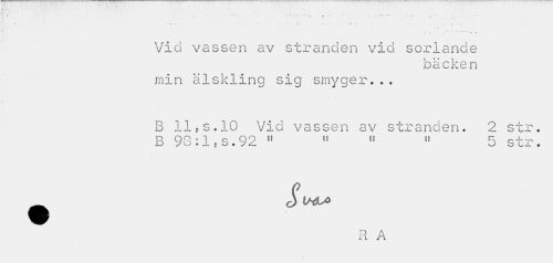 //// • " ' - ,"'~r *' ' " ~ ts n» •« ' V t *"• //// * * • » //// Vid vassen av stranden vid sorlande //// bäcken //// min älskling sig smyger... //// B lljS.10 Vid vassen av stranden. 2 str. B 98:1, s. 92 fS ft " » 5 str. //// R A ////
