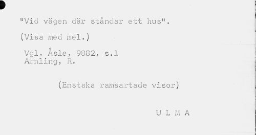 //// "Vid vägen där ståndar ett hus". //// (Visa med mel.) //// Vgl. Åsle, 9882, s.l Arnling, R. //// (Enstaka ramsartade visor) //// U L M A ////