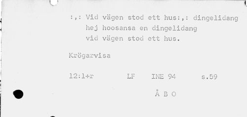 //// ^s-, v. //// Vid vägen stod ett hus:,: dingelidang hej hoosansa en dingelidang vid vägen stod ett hus. //// Krögarvisa //// 12:1+r LF INE 94 s.59 ////
