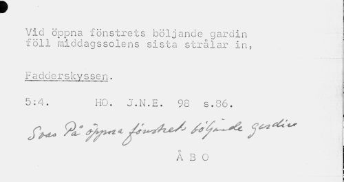 //// w //// Vid öppna fönstrets böljande gardin föll middagssolens sista strålar in, //// Fadderskyssen. //// 5:4. HO. J.N.E. 98 s.86. //// ÅBO ////