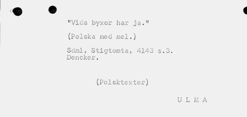//// "Vida byxor har ja." //// (Polska med mel.) //// Sdml, Stigtomta, 4143 s.3. Dencker. //// - //// (Polsktexter) //// U L M A ////
