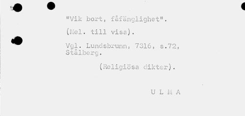 //// m w % //// "Vik bort, fåfänglighet". (Mel. till visa). //// ^^ Vgl. Lundsbrunn, 7316, s.72, //// Stålberq. //// (Religiösa dikter). //// / //// U L M A ////