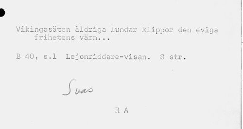 //// I //// Vikingasäten åldriga lundar klippor den eviga frihetens värn... //// j-i //// B 40, s.l Lejonriddare-visan. 8 str. //// « //// J //// R A ////
