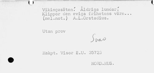 //// Vikingasäten. Åldriga lundar. Klippor den eviga frihetens värn... (mel.not.) A.L.Orstadius. //// Utan prov //// Mskpt. Visor E.U. 35723 ^ NORD.MUS. ////