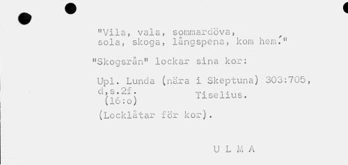 //// # //// "Vila, vala, sommardöva, //// sola. skoga, långspena, kom hem T11 //// "Skogsrån" lockar sina kor: //// Upl. Lunda (nära i Skeptuna) 303:705, //// ; Tiselius. //// (16:o) //// (Locklåtar för kor) . //// U L M A ////